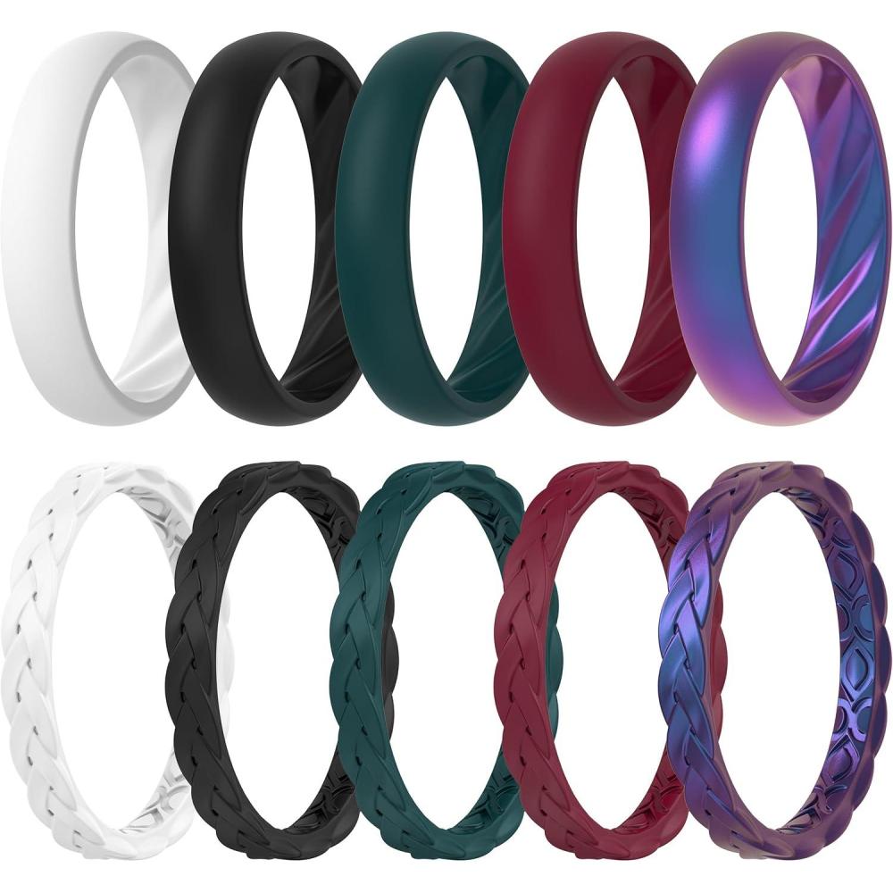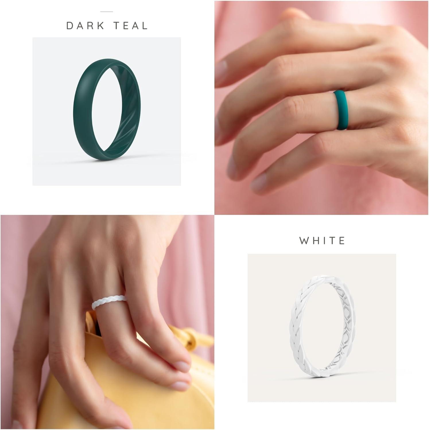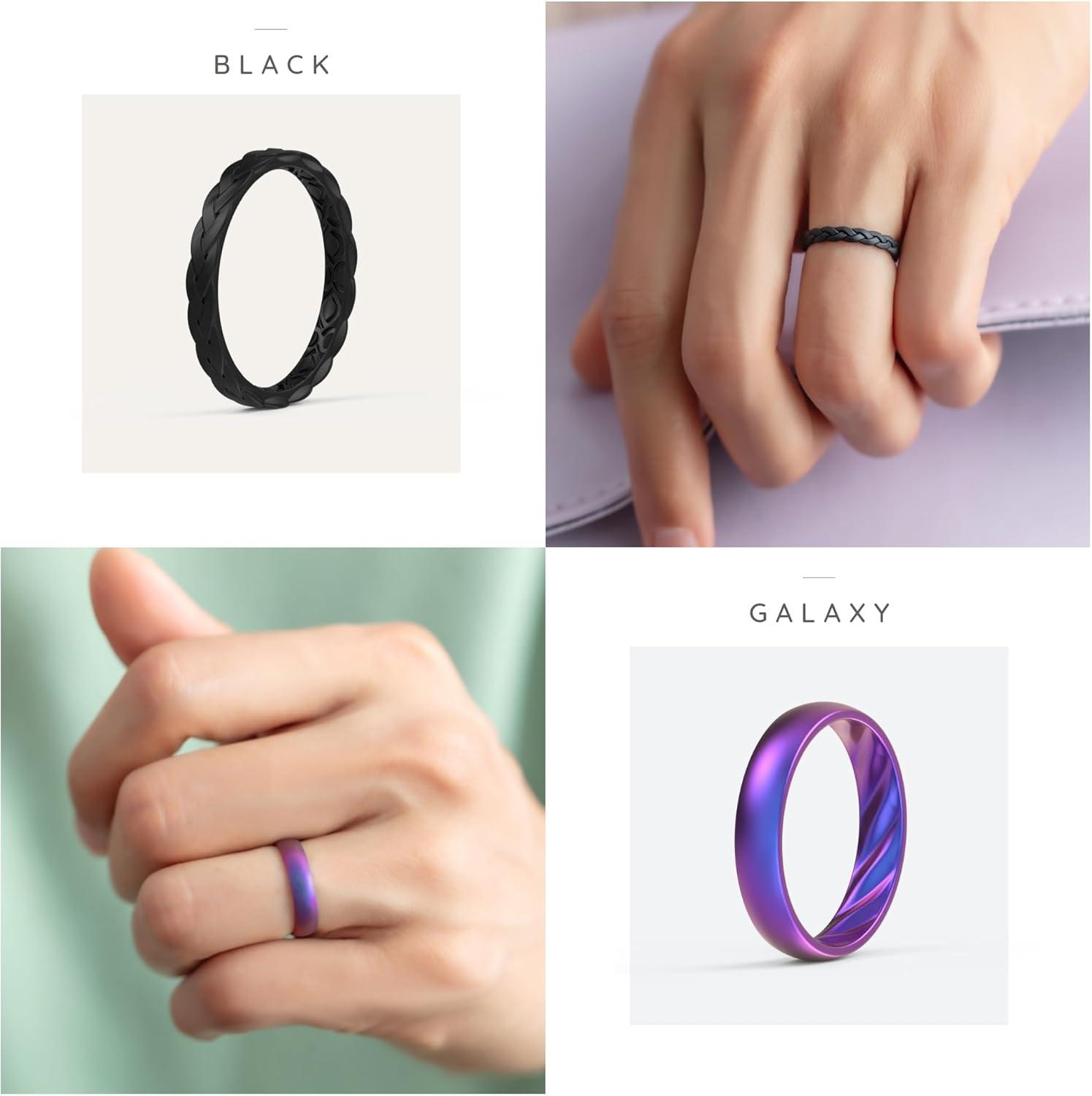 ThunderFit Silicone Rings for Her – Mix Women’s Silicone Wedding Rings, 1.8mm Thick Rubber Engagement Rings Braided & 4mm Classic Rings Combo(Pack C: White Black Dark Teal B Dark Red G Galaxy)