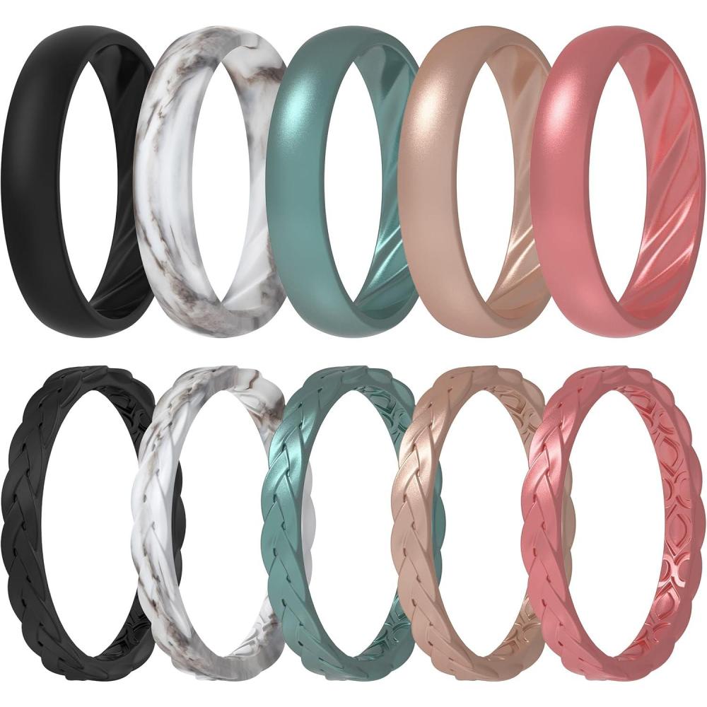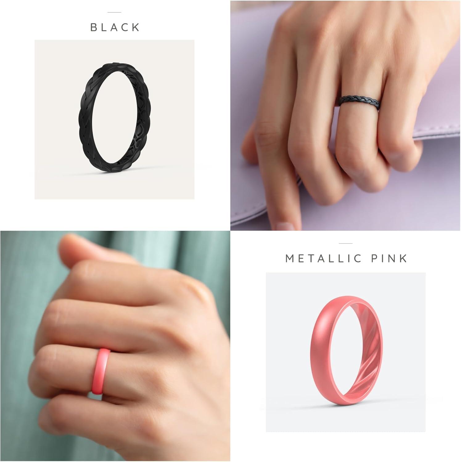 ThunderFit Silicone Rings for Her – Mix Women’s Silicone Wedding Rings, 1.8mm Thick Rubber Engagement Rings Braided & 4mm Classic Rings Combo(Pack K: Black Marble C Blue Green Toast Metallic Pink A Metallic)
