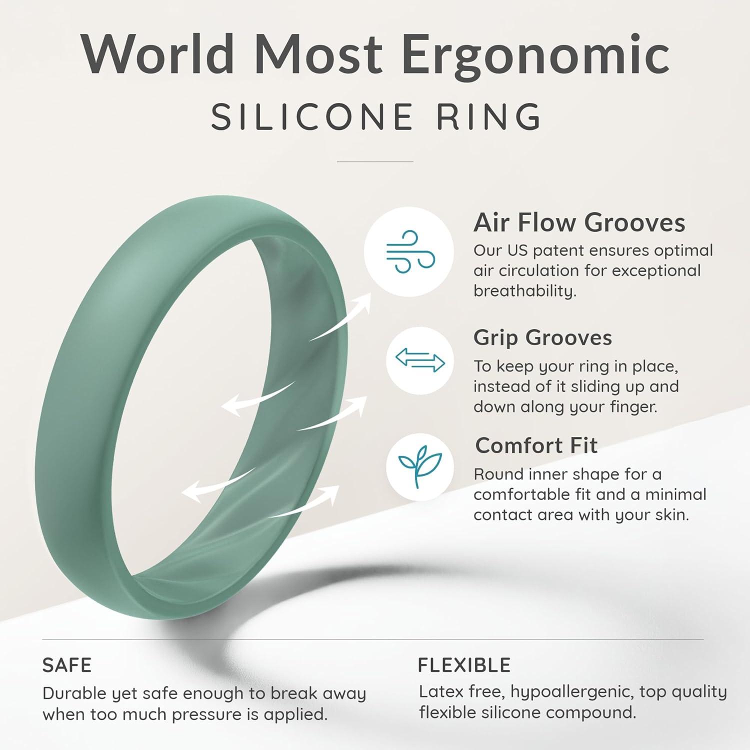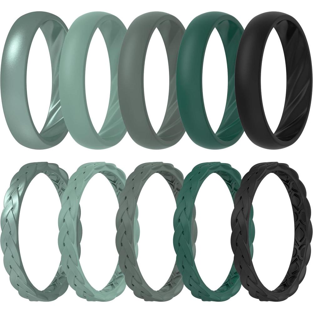 ThunderFit Silicone Rings for Her – Mix Women’s Silicone Wedding Rings, 1.8mm Thick Rubber Engagement Rings Braided & 4mm Classic Rings Combo(Pack O: Green Bay Metallic Feldspar Laurel Wreath Galapagos Green Black)