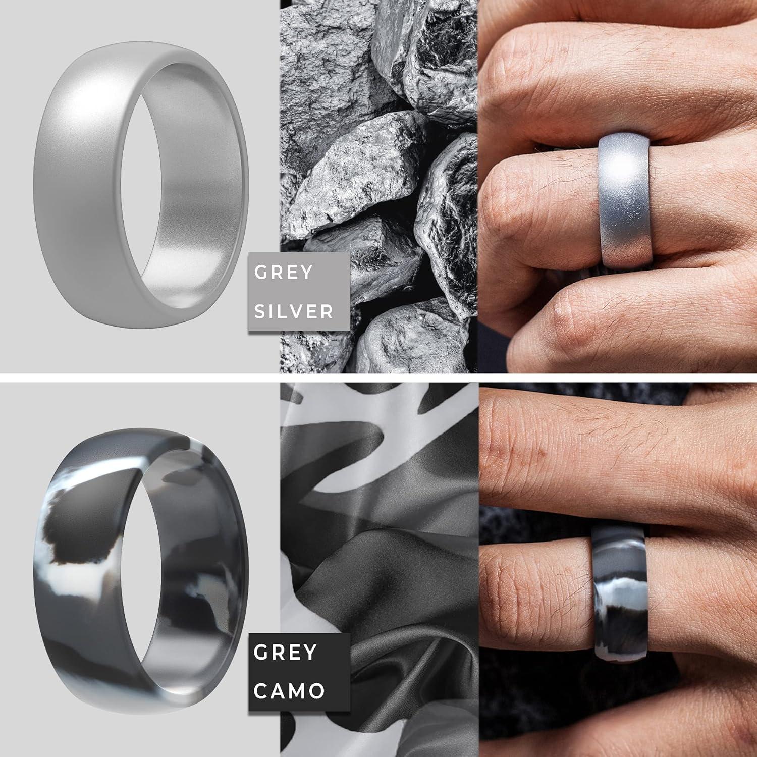 ThunderFit Silicone Wedding Rings for Men, Rubber Engagement Bands 8.7mm Wide 2.5mm Thick – 1/2/3/4/5/6/7/12/16 Variety Multipack(Pack S: Charcoal Black Iron Grey Grey Silver Grey Camo)